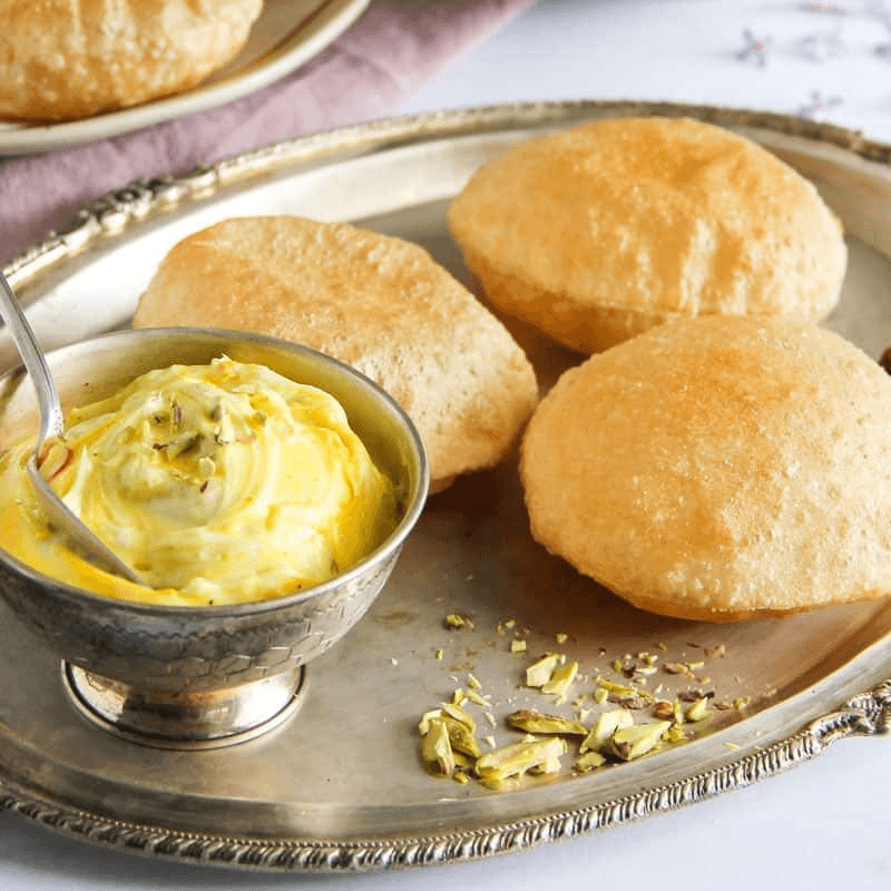 Shrikhand Puri is a classic Indian dish pairing creamy, sweetened strained yogurt flavored with cardamom and saffron with hot, puffed puris.