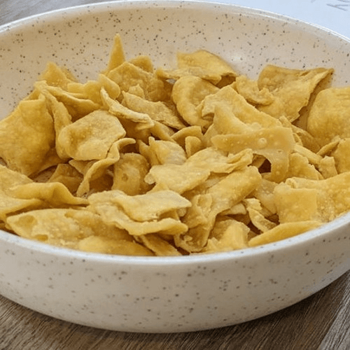 Flat wavy chips made out of gram flour and salt and sprinkled with chili pepper and sanchoro (ajwain or known as black salt )