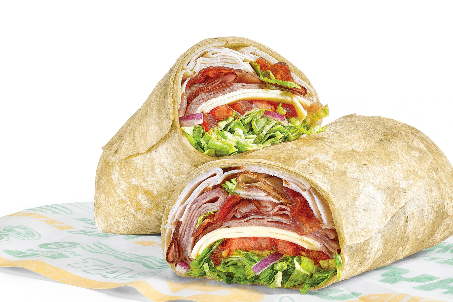 Oven-roasted Turkey, ham, American cheese, bacon, lettuce, tomatoes, onions & mayo, wrapped in tortilla.