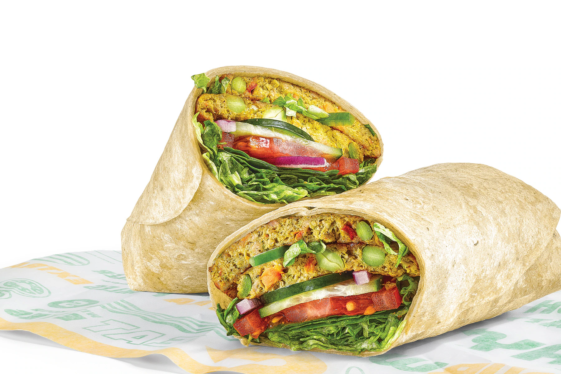 Veggie patty, American cheese, lettuce, spinach, tomatoes, cucumbers, peppers, & onions, wrapped in tortilla.