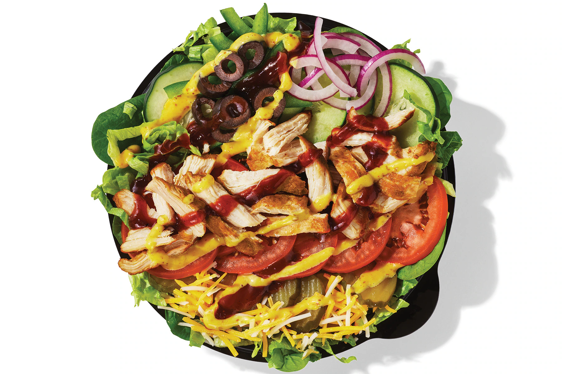 Tender Rotisserie-style chicken, Monterey cheddar cheese, pickles, BBQ sauce, Honey Mustard sauce, cucumbers, green peppers, black olives, tomatoes & onions served on a bed of lettuce & spinach.
