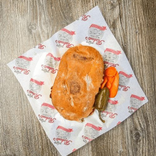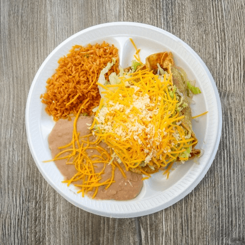 Shredded beef with beans and cheese inside. Guacamole, sour cream, cheese and queso on top. Lettuce and salsa fresca on the plate