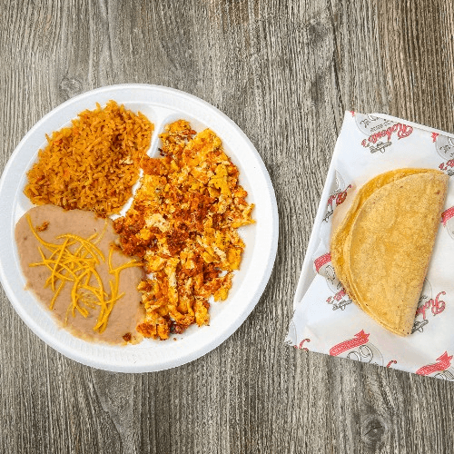 3 eggs, corn tortilla squares, green salsa, cheese and queso